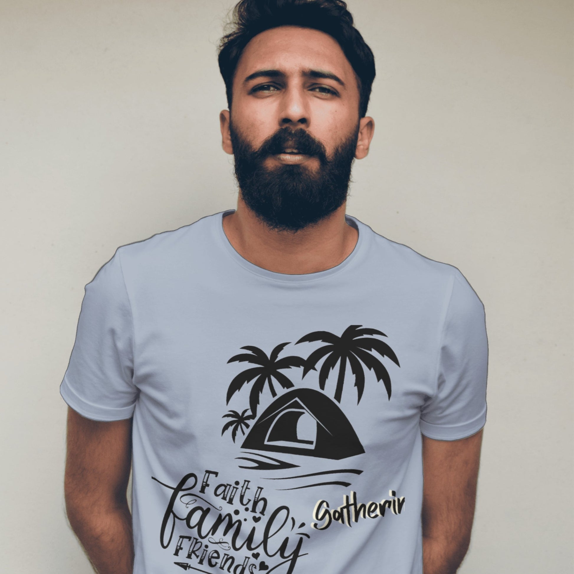 This light gray T-shirt π showcases a charming black graphic of two palm trees π΄ and a tent βΊ, symbolizing outdoor adventures. Below the design, the text "FAITH, GATHERING, FAMILY & FRIENDS" is written in a playful, handwritten font βοΈ, celebrating togetherness. With a relaxed fit and short sleeves, itβs ideal for casual outings or cozy gatherings with loved ones π¨π©π§π¦.